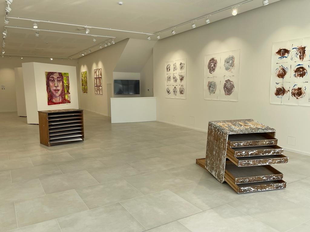 In this exhibition you can see several abstracted portraits. The paintings in general have a ‘virtual meeting’ format, with a standard screen of 9 sections, representing our new way of communicating, since the advent of Covid.